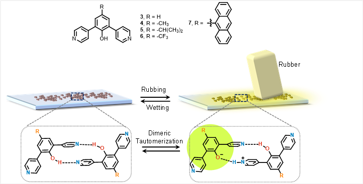 近日,朱亮亮课题组发现一种可以通过双氢键形成双吡啶苯酚类化合物的交联体。这种体系能够在固态稳定存在,并且在橡胶类材料的摩擦所形成的微弱电场的诱导下,双氢键二聚体结构中可以发生质子转移。这一过程瞬间产生了一种从暗态到明态的互变异构体,从而使材料的荧光量子产率提高了450倍以上,产生固态“点亮”效果。由于互变异构的可逆性,这一类材料可以重复使用,从而开发出加密应用。此外,对结构的进一步修饰可以实现不同的性能拓展,为新一代智能材料的设计开辟了更多的可能性。