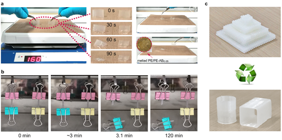 如图3所示,在160 ˚C下,LDPE样品受热后快速熔融、瘫软,而植入了动态交联聚乙烯网络的样品,软化速率及形变程度显著降低。动态交联聚乙烯的硼酸酯交联位点,能够在热刺激下发生可逆交换反应,促进聚合物交联结构变换和重组,从而实现对交联聚合物的重复加工。可以采用模压、注塑及3D打印的方法对材料进行加工,成型后的样品可以再次塑形,成为其他形状的产品(图3)。
