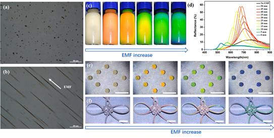 图1. (a、b)磁性纳米粒子的水分散液及其在磁场下的1D磁性链的组装,(c、e、f)磁性纳米粒子分散液的磁响应结构色展示,(d)不同磁场强度下磁性纳米粒子分散液的反射光谱