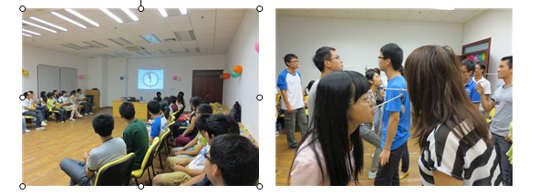 晚会由2012级硕士研究生胡必成和胡建彤同学主持。首先播放了介绍新生的MV短片,拉开晚会的帷幕;同时辅导员王芳老师致辞。晚会正式开始。晚会的主要目的是通过游戏互动使同学之间深入了解和融入新的班集体,增强集体感。