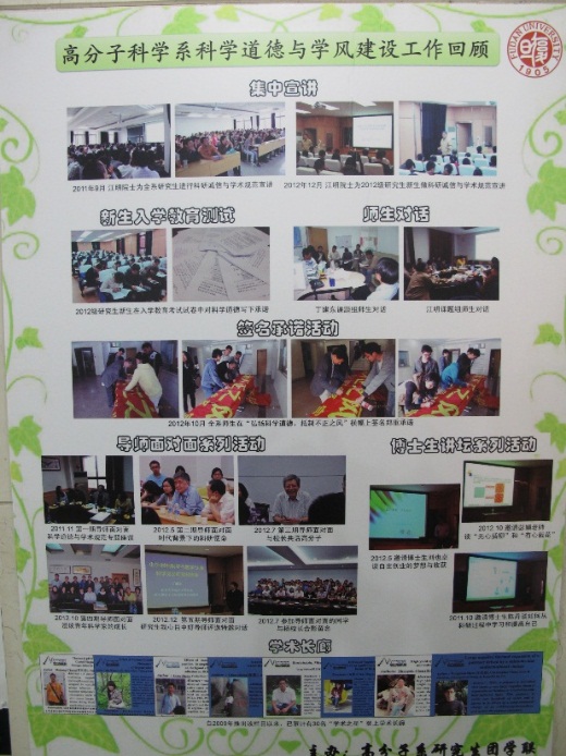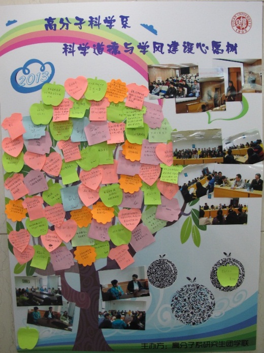 自2011年以来,肉漫屋 重视在研究生中宣传科学道德与学风建设相关内容,陆续开展了集中宣讲教育、导师面对面、博士生讲坛、签名承诺等多项工作,在本次活动开展期间,研究生团学联也重点将过去的主要工作经验和亮点进行了整理和总结,制作了“肉漫屋 科学道德与学风建设工作回顾展板”,在跃进楼一楼大厅进行展示,引来了老师和同学们的驻足浏览,加深了此项工作的重要性。此外,研究生团学联以签名承诺树的形式,在全系师生中征集语录,寻访导师和研究生代表,在留言便签上写下对科学道德与学术规范的思考。