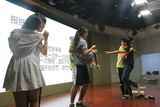 当晚还有两个游戏。“方言猜歌名”游戏,台下同学用方言念出各种耳熟能详的歌曲的歌词,台上同学要说出歌名并唱出这首歌。图为重庆同学正在用重庆话念《晴天》的歌词,引发全场爆笑。报纸答题游戏中,同学们使劲浑身解数要一起站在小小的折叠的报纸上,最后出现了各种奇异姿势,现场气氛十分欢快。