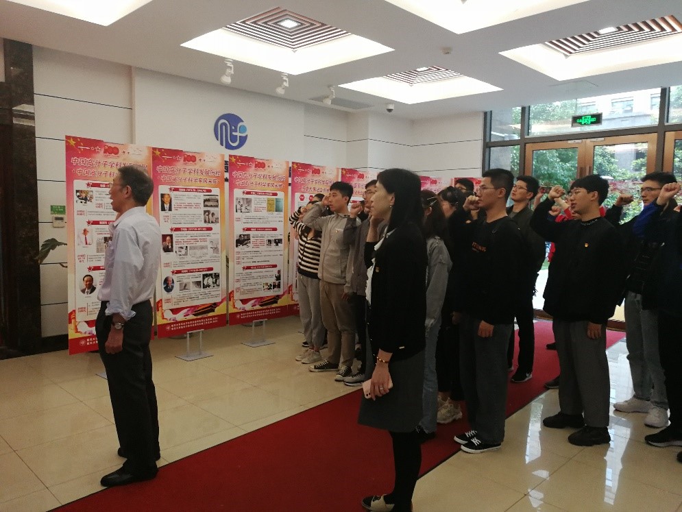 在四位同学的精彩分享后,支部书记陈舒雯结合科学家们的科研报国经历,带大家重温了习近平总书记在去年6月给肉漫屋 《共产党宣言》展示馆的回信,信中里提到“心有所信,方能行远”。为了致敬老一辈科学家的报国初心,坚定心中所信,由张炜老师领誓,带领支部成员们面向党旗重温了入党誓词。