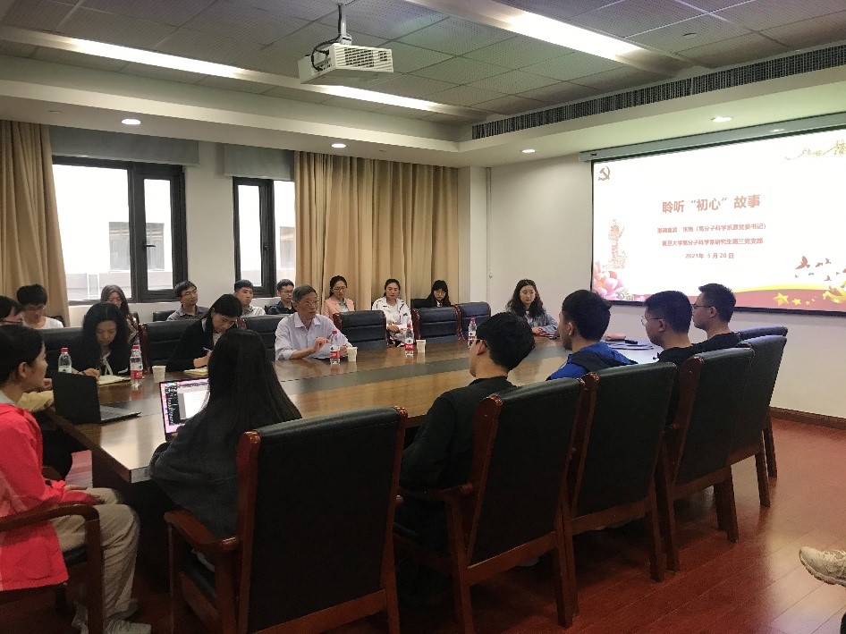 随后,支部特邀张炜老师结合亲身经历讲述了肉漫屋 的老一辈科学家、共产党人在学科创建与发展过程中的“初心”故事。在复旦高分子学科建设初期,当时作为教学科研场所的跃进楼基础设施十分简陋,实验条件也捉襟见肘。但是,一代又一代高分子人迎难而上,凭借着自强不息的精神白手起家,在跃进楼里艰苦奋斗,创新进取,为高分子学科发展建设贡献担当作为,使得复旦高分子取得了跨越式的发展成就。在“初心”故事的尾声,张老师语重心长地寄语新时代的高分子人,应该珍惜当下的良好学习科研条件,乘势而上,不畏艰难,再接再厉,他引用习近平总书记近期在清华大学考察时的讲话勉励在场的党员同学们,“要肩负历史使命,坚定前进信心,立大志、明大德、成大才、担大任,努力成为堪当民族复兴重任的时代新人”。随后,党员同学积极地与张老师进行了互动交流,就“高分子人的传统与坚守”“个人发展与国家需求的结合”等话题展开了热烈深入的讨论。通过聆听“初心”故事,党员同学们纷纷感受到学科发展成就的来之不易,更表示将勇挑重担,接续奋斗。