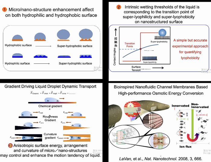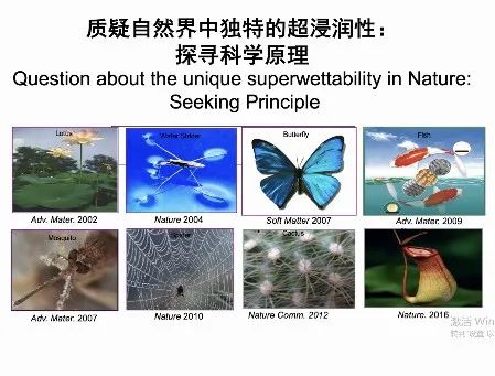 随后,江老师介绍了超浸润界面方面的理论知识,以简单的接触角概念为核心延展出了各种各样的研究方向,并提出人脑、鳗鱼中发现的有趣现象,从而引出了仿生超浸润界面体系的概念。