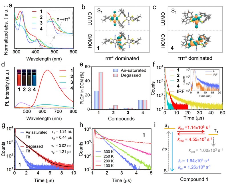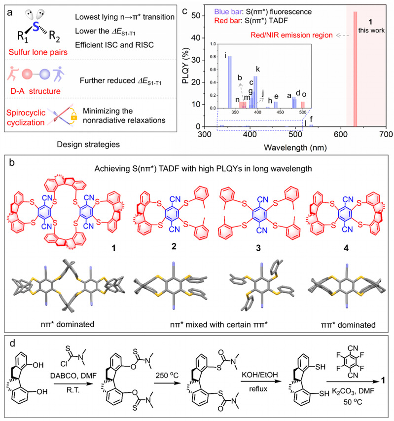 图1. a) nπ∗ TADF发光分子设计思路。b)目标化合物1与模型化合物2-4的分子结构和晶体结构。c)化合物1与已报道的具有nπ∗发射的化合物的发光波长与量子效率的比较。d)化合物1的合成步骤。