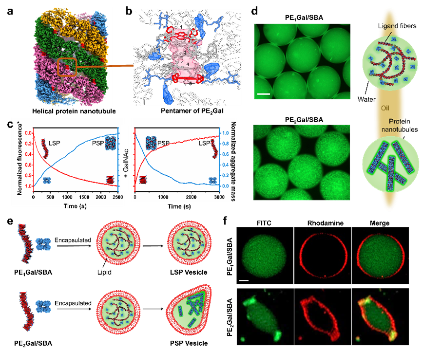 图1. 配体超分子聚合物诱导的人工微管。(a)人工微管的冷冻三维重构图谱;(b)配体分子在人工微管中的排布;(c)配体超分子聚合物与人工微管的动态竞争;(d)限域空间内人工微管的制备;(e,f)人工微管诱导的脂质体变形。