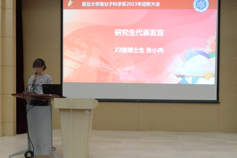 接下来,2023级博士生张小冉作为新生代表发言。作为一名提前一周进校参加研究生骨干培训班的学员,她深刻意识到在复旦的学习“要经历自信心被打击再重建的过程”。通过对自己硕士期间科研经历的回忆,她以自己初入实验室的懵懂到迷茫到突破到最终热爱的经历,启示同学们应当不忘初心、持之以恒、携手努力、共赴美好的前程!