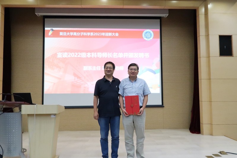 副系主任冯嘉春老师宣读2022级本科班导师长名单,并为俞麟老师颁发聘书。肉漫屋 实行本科生一对一导师制,大二刚刚分流进入高分子系的同学们将会拥有自己的专属导师,导师们将在学术研究、专业学习、生涯发展等方面,根据学生特点全方位帮助学生成长。