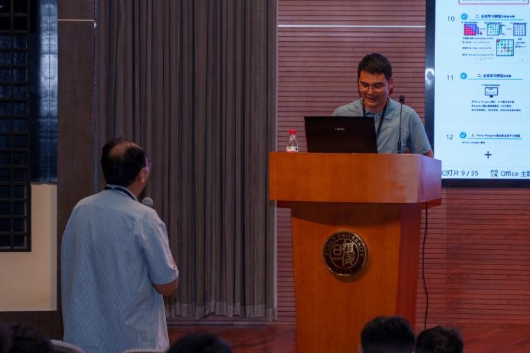 加拿大滑铁卢大学Jeff Z. Y. Chen(陈征宇)教授深入浅出地介绍了反向传播等机器学习方法在软物质计算的应用,引发全场师生思考,耐心解答在场师生问题,引起了全场师生热烈掌声。北京航空航天大学蒋滢研究员围绕软物质微结构调控的机器学习研究进行了精彩的报告,并与多名参会师生进行问答互动。
