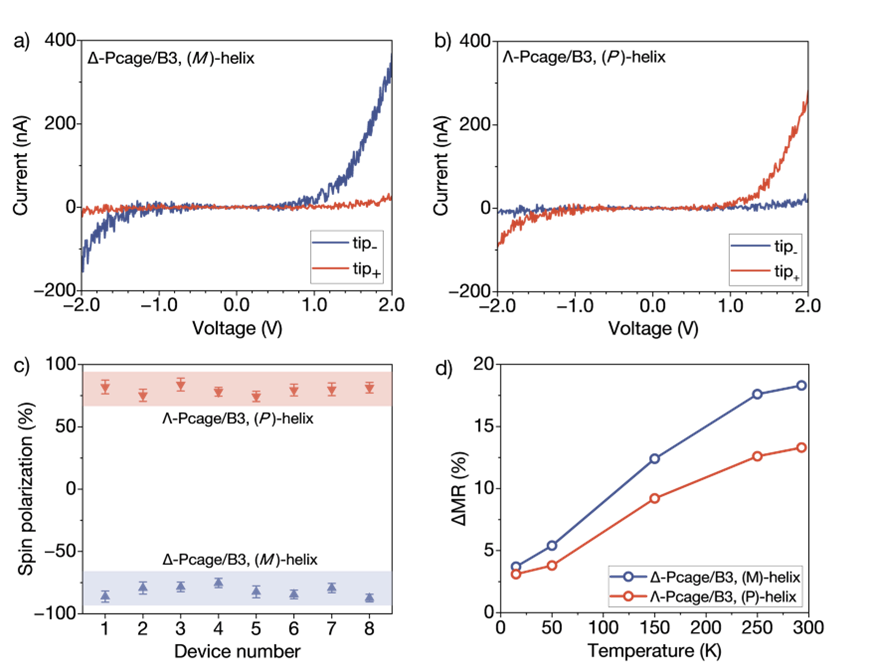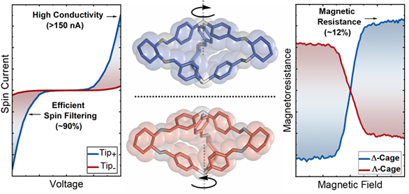 三角双锥型分子笼由手性二胺和三芳基膦通过[2+3]缩合反应制备(Δ-Pcage和Λ-Pcage),借助磁导电原子力显微镜测量手性分子笼纳米薄膜(2~3 nm)的I-V曲线表明,两种均手性分子笼具有截然相反的自旋极化能力,其中Δ-Pcage自旋极化率高达-87%,而Λ-Pcage为81%,接近目前最高的杂化钙钛矿的SP值;二者的自旋电流也超过150 nA,比常规有机分子制备的CISS器件高20~30倍。将分子笼制备成自旋阀器件,磁阻测试进一步表明两种手性对映体的磁阻效应分别为12%和8%,超过传统的手性分子自旋器件。
