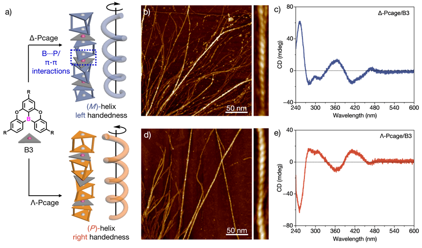 以此为基础,利用B–P路易斯酸碱对的超分子相互作用可以将含三芳基分子笼和含三芳基硼非手性平面化合物(B3)组装成单手性笼基纳米螺旋纤维(Δ-Pcage/B3和Λ-Pcage/B3),利用手性转移效应实现了导电能力和磁阻效应的协同放大,其导电能力可进一步提高2倍、自旋磁阻可增加近30%。