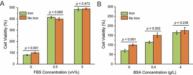 In order to explore the effect of serum on oxidative damage along with iron corrosion, human umbilical vein endothelial cells (HUVECs) were cultured in DMEM containing 0.8 g/L carbonyl iron powder and different concentrations of fetal bovine serum (FBS). The groups without carbonyl iron powder were set as controls, and the cell viability was characterized by CCK-8 kit. As seen from Figure 3A, carbonyl iron powder had no effect on cell viability when only 0.5% FBS was added, indicating that serum could reduce the oxidative damage of cells caused by iron corrosion significantly. The results in Figure 3B illustrate that albumin in serum plays an important role in reducing oxidative damage. In addition, the authors found that the serum and albumin worked mainly via scavenging the hydroxyl radicals.