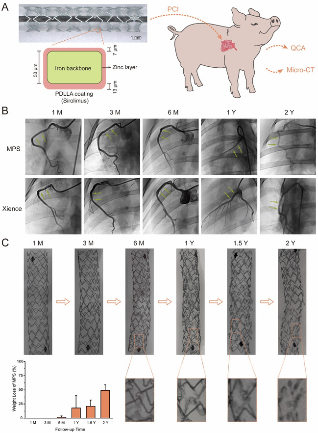 Fig. 4 (A) Schematic diagram of the design and implantation of the metal-polymer composite stent (MPS). (B) The coronary angiography images of the porcine coronary artery at 1, 3, 6 months and 1, 2 years after the implantation of MPS or Xience. (C) The micro-computed tomographic (micro-CT) images of the stented coronary artery at each follow-up point.