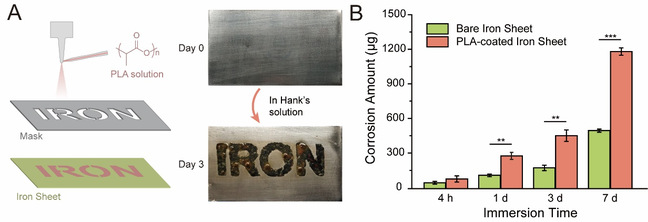 Fig. 2 PLA coating accelerates iron corrosion in Hank’s solution. (A) Illustration of the iron sheets with the PLA coating of an “IRON” pattern experiencing ultrasonic spraying of a PLA solution thorough a mask (left), and the optical photographs of the iron sheets before and after being immersed in Hank’s solution for 3 days (right). (B) The corrosion amounts of the PLA-coated iron sheet and bare iron sheet after being immersed in Hank’s solution at 37 °C for 4 hours, 1 day, 3 days, and 7 days.