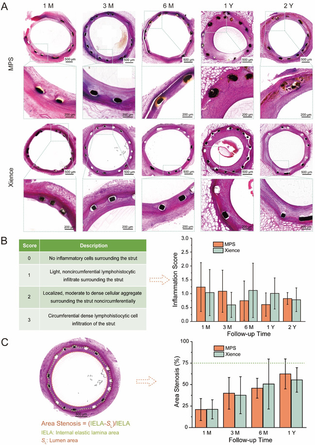 Fig. 5 (A) Hematoxylin and eosin (H&E) staining images of the porcine coronary artery 1, 3, 6 months and 1, 2 years after the implantation of MPS or Xience. (B) The criteria for evaluation of inflammation scores by H&E staining images (left), and the inflammation scores of the stented coronary artery at each follow-up point (right). (C) Schematic diagram of the area stenosis calculated by H&E staining images (left), and the area stenosis of the stented coronary artery at each follow-up point (right).