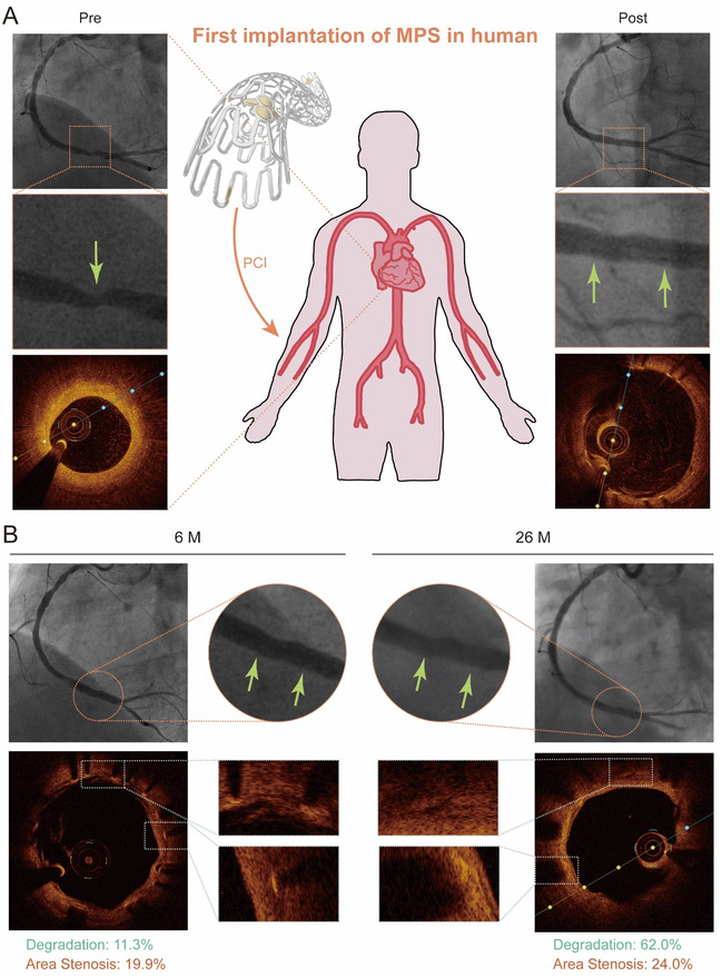Fig. 6 (A) Schematic diagram of the first implantation of MPS into a 60-year-old man, and the coronary angiography images and the OCT images of the right coronary artery before (left) and immediately after percutaneous implantation (right). (B) The coronary angiography images and the OCT images of the right coronary artery stented by MPS 6 months (left) and 26 months (right) after implantation.