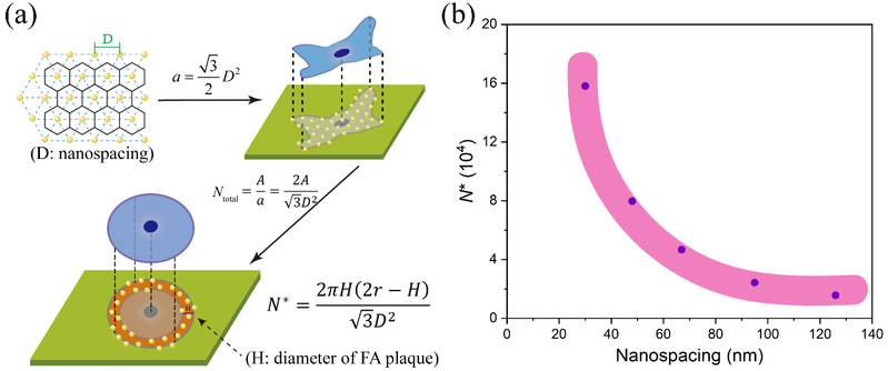 Figure 6 (a) Schematic illustration to demonstrate the deduction process of the possible critical number of integrin-ligand binding (N*); (b) The curve of N* versus nanospacing based on experimental results.