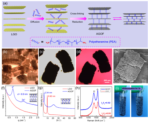Non-exfoliated layered graphene oxide (LGO) was used to prepare AGOF, the precursor of graphene-based heterostructures. LGO consists of well-aligned GO nanosheets that contain abundant oxygen functional groups and similar sheet size and nanometer-scale interlayer spacings. The flexible interlayer chemistry makes LGO a unique precursor in designing 2D confined space. Inspired by the reticular chemistry, in which a well-defined periodic structure is usually composed of building blocks (such as GO units in LGO) and building bonds (covalent linker between two GO units), Lu`s group propose a precisely adjusting method to control the 2D interlayer space of AGOF through crosslinking between adjacent GO sheets. The typical synthetic process of AGOF is shown in Figure 1a. Linear polyetheramine (PEA, molecular weight 2 kg/mol, named as PEA-2k) was used as a linker, because its amino end groups can react with the epoxy groups on GO through the ring-opening addition reaction. This enables the GO sheets in LGO to be immobilized to form structurally stable AGOF and avoids dissociation.