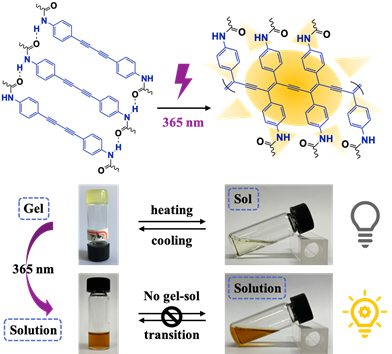 Organogel systems are considerably favorable for the pre-arrangement of monomers for topochemical transformation and polymerization. Inspired by the encouraging finding, Zhu’s group proposed a 365-nm light initiated topochemical strategy by polymerization of a low molar-mass organic gelator based on a diphenyldiacetylene (DPDA) derivative containing amide groups in para-position. It takes advantage of the incorporation of cholesterol and (R)-α-lipoic acid to realize the absorption regulation and a chiral organogel formation both. In-situ topochemical reaction initiated by 365-nm light can be efficiently conducted to afford polymeric species, whereby the three-dimensional hydrogen bond network plays a key role to facilitate the photopolymerization process. Furthermore, the process can be facilely indicated by distinctive photoluminescent enhancement along with gel transformation on the basis of enlarged π-conjugated skeleton of DPDA, providing a valuable methodology for latent application as fluorogenic materials.