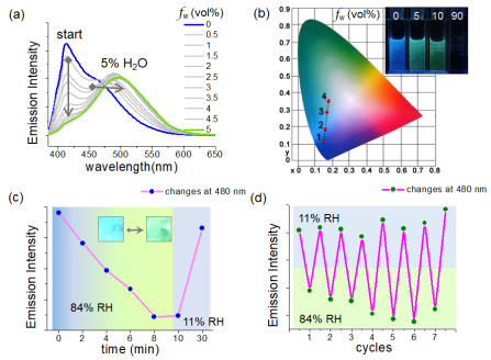 2) Moreover, their molecules can exhibit a remarkable fluorescent color conversion from blue to green light. Such a behavior can be exemplified into a visualized moisture sensing process both in solution and in solid film. As compared with the relevant sensing process generally achieved by certain charge transfer mechanisms based on large conjugated backbones or incorporated luminophores (Chem. Commun., 2011, 47, 4448; Phys. Chem. Chem. Phys., 2012, 14, 8803; RSC Adv., 2014, 4, 25330), their system revealed a relatively simple structure (a single azulene luminophore), generalized control fashion (a regulation by non-covalent interactions), and a well distinguishable function (strong luminescences from higher excited states) for facilitating the practical usage.