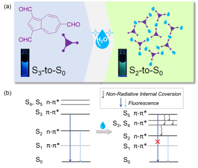 1) They presented a rational design of a novel azulene-based emitter modified by triformyl groups, in which the anti-Kasha's rule emissions can be high efficiently revealed with an outstanding fluorescent quantum yield in the azulene family. The emitter initially gave rise to S3-to-S0 dominant emission, and it can be toggled into S2-to-S0 dominant one upon the H-bond formation between the triformyl groups and water molecules. These results signify an unprecedented emissive switching of high excited states from the perspective of H-bonding regulated distribution of excited-state energy.