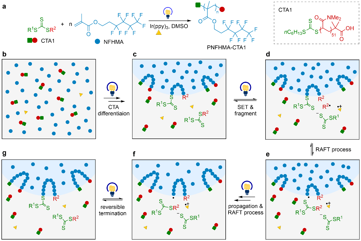 The cell differentiation process in nature works where a portion of stem cells keep proliferating and differentiating, enabling the generation of tissues through subsequent propagation, while the remaining stem cells lie dormant, but can be activated by particular stimuli to regulate homeostasis via cell functions throughout lifetime. The researchers envisioned that if the controlling agents could differentiate into two groups ‒ a propagating group (PG) in charge of chain growth, and a supporting group (SG) remaining dormant and responsible for reversible-deactivation of propagating chains to maintain the livingness of polymerization, the cooperative roles of PG and SG agents would enhance the livingness of RDRP with a high ratio of monomer to the growing chain, hence facilitate the generation of UHMW polymers (Fig. 2). Meanwhile, fluoropolymers possess remarkable attributes such as high hydrophobicity, tunable lipophilicity and outstanding thermal and chemical stability, which have stimulated broad applications. They envisaged that the fluorine-fluorine interaction between the fluorinated monomer and the in situ generated fluoropolymers could promote the migration of monomer and CTA, thus implementing the differentiation process of CTA. The distinct chain growth mode breaks the upper limit of molecular weight in conventional living polymerizations by leading the monomers to be selectively polymerized on a particular small portion of the initiators, achieving the successful preparation of UHMW polymers of fluorinated (meth)acrylates and acrylamide (Mn > 106 Da); meanwhile, as assisted by the interaction between the PG and SG, the obtained polymers displayed dramatically narrow dispersities (Đ ~ 1.1) and excellent chain-end fidelity, facilitating the precise synthesis of UHMW block copolymers.