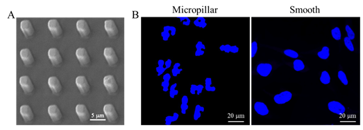 Figure 1. Cell nuclear deformation on a PLGA micropillar array. (A) SEM image of the PLGA micropillar array. (B) Fluorescence images of the nuclei of HeLa cells on the PLGA micropillar array and smooth surface.