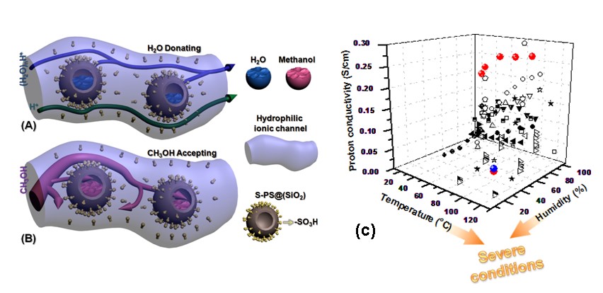 Fuel cell (FC) has been becoming one of the most competitive powers in the field of internal combustion engine, owing to its high energy conversion efficiency and low pollutant. As the key component in FCs, the proton exchange membrane (PEM) separates fuel from oxidant and simultaneously conducts protons. However, PEMs suffers from a significant deterioration in proton conductivity under high-temperature and/or low-humidity conditions due to dehydration or water loss of PEMs, which limits the application of FC.