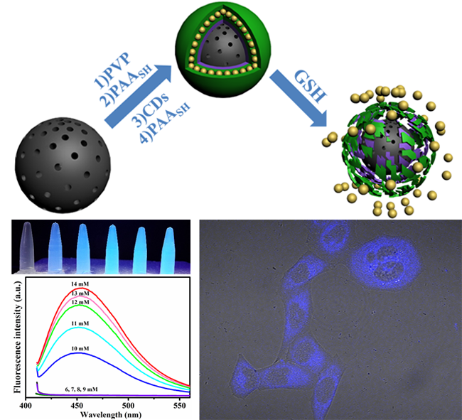 Intracellular redox state plays an important role in regulating cell behaviors and functions, and GSH (glutathione) is considered to be the major contributing molecule to the intracellular redox state. Measurement of GSH level has been used to estimate the intracellular redox state. Recently, Prof. Yang group developed a novel and sensitive carbon dot-based nanosensor for detection of intracellular GSH concentration through assembling a disulfide bond cross-linked polymer/carbon dots multilayer shell on mesoporous silica nanoparticles surface. Through tuning the cross-linking density of disulfide bonds, the responsive concentration of GSH varied, making it available for detecting intracellular GSH concentration. The resulting nanosensor affords a novel and promising approach in detecting GSH concentrations of cells, which is of great significance on relevant applications.