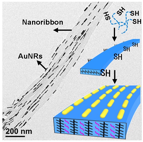 Recently, prof. Juan Peng and coworkers reported a robust hierarchical bottom-up assembly strategy for crafting nanoribbon-shaped nanocomposites composed of conjugated polymer poly(3-hexylthiophene) (P3HT) and plasmonic gold nanorods (AuNRs). First, P3HT-SH nanofibers were formed due to interchain - stacking. Upon the addition of AuNRs-DDT, P3HT-SH nanofibers were transformed into nanoribbons decorated with the aligned AuNRs on the surface. Quite intriguingly, when P3HT-SH nanoribbons and nanofibers are coexisted, AuNRs and Au nanoparticles (AuNPs) are found to selectively decorate P3HT-SH nanoribbons and nanofibers, respectively. These hierarchically assembled nanocomposites exhibited the broadened and red-shifted absorption bands of AuNRs and displayed quenched photoluminescence of P3HT. Such conjugated polymer/plasmonic nanorod nanocomposites may find potential applications in many fields, such as building blocks for complex superstructures, optical biosensors, and optoelectronic devices.