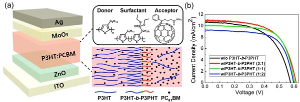 Recently, Prof. Juan Peng and coworkers designed a series of all-conjugated diblock copolymers, poly(3-hexylthiophene)-b-poly(3-(6-diethylphosphonatohexyl) thiophene) (P3HT-b-P3PHT), and used them as additives to improve the performance of P3HT:PC61BM-based photovoltaic devices. Usually, the increased PCE are attributed to an improvement in Jsc or Voc by carefully designing organic photovoltaic materials. In this work, the significant increase in the PCE was mainly due to the improvement in fill factor (FF). The P3HT-b-P3PHT diffused at the P3HT:PC61BM interface, improved the miscibility between them, optimized the nanoscale morphology of the photoactive layer, and reduced the active layer roughness, which enlarged the donor/acceptor interfacial areas, thus reduced the charge recombination rate. The research provides a possible strategy toward high efficiency organic photovoltaic devices with enhanced thermal stability.