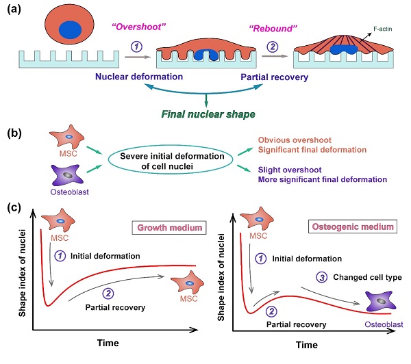 The overshoot phenomenon of nuclear deformation on PLGA micropillar array was found by Ding’s group. Severe self-deformation of cell nuclei happened at initial stage, then the deformed nuclei partially recovered. The results of treatment by cytoskeleton inhibitor illustrated that actin cytoskeleton took part in providing the driving force of nuclear recovery. In observations of the nuclear deformations of mesenchymal stem cells (MSCs), differentiated cells and differentiating cells, they found non-monotonic deformation in all the cases; yet the kinetic process exhibited cell-type dependence with one overshoot for MSCs and differentiated cells, and two overshoots for the differentiating cells.