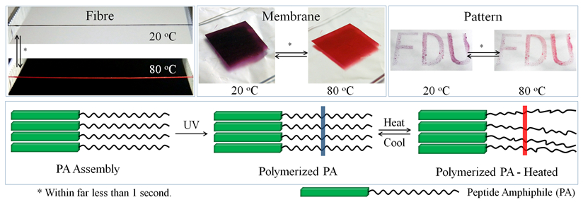 Professor Zhengzhong Shao and coworkers at Fudan University published an interesting paper entitled “Ultrafast and Reversible Thermochromism of Conjugated Polymer Material Based on Assembling of Peptide Amphiphiles” in Chemical Science on 2 July 2014. This is a cooperative research study with Professor David Porter from Oxford University in UK and Doctor Dennis Löwik from Radboud University in the Netherlands. Hui Guo, a PhD student of Fudan University, is the first author of this paper.