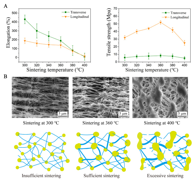 Sintering temperature is another key parameter to control the quality of ePTFE. The nodes of the resultant ePTFE film depended on sintering temperature, as shown in Figure 4. The higher the temperature, the higher the fraction of crystalline zone transformed into amorphous zone. Larger nodes and stronger fibrils improved the strength of the membrane. However, over-sintering also led to the reduction of the uniformity of pore size, and even breaking of the fibrils.